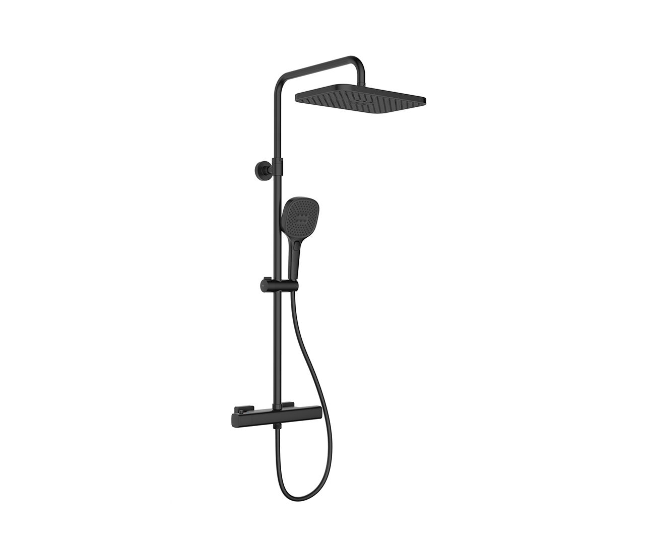 Luxe zwarte regendouche met thermostaatkraan. Combineert comfort, veiligheid en modern design.