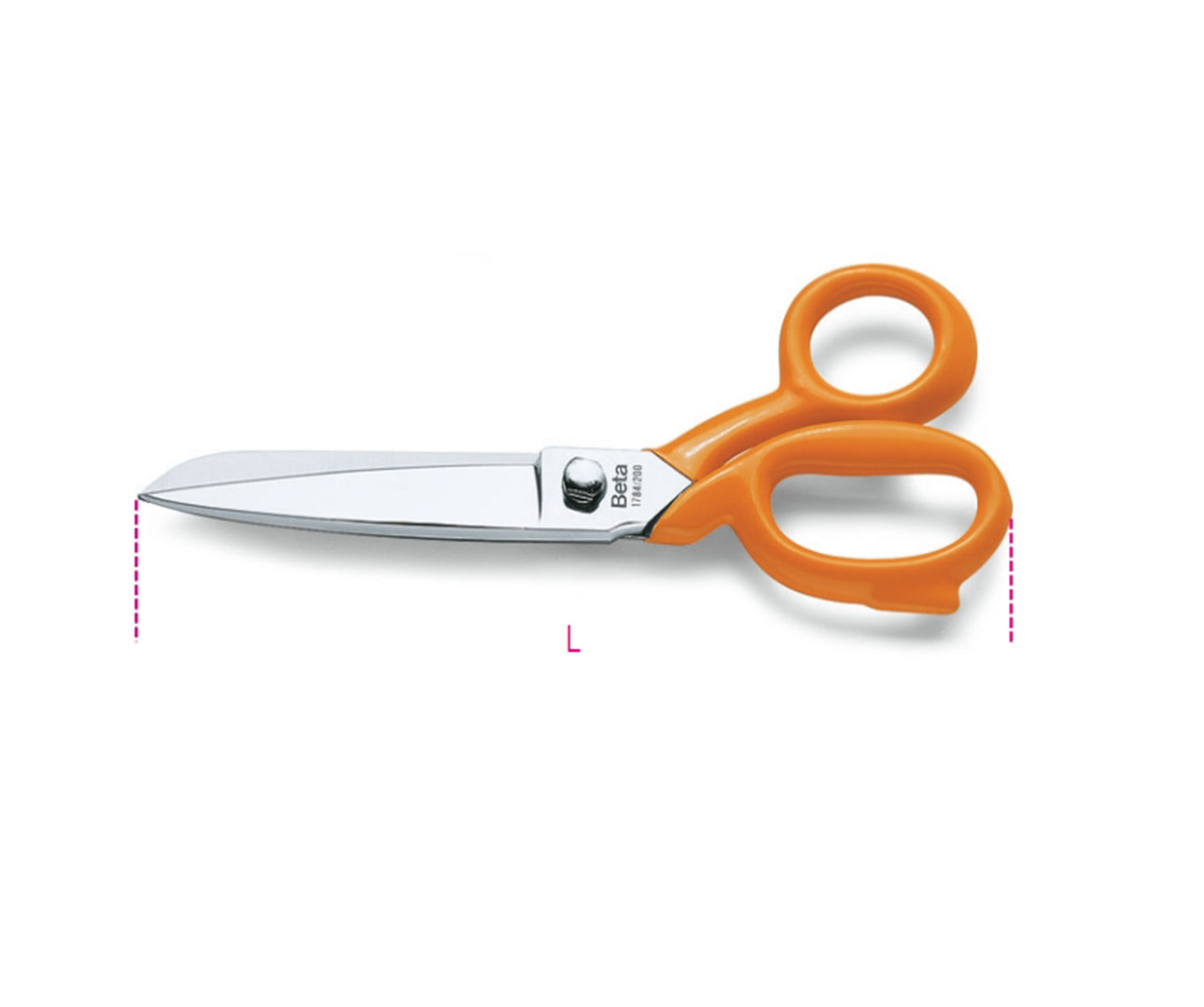 De kleermakersschaar heeft een asymmetrische greep en een scherpe snede. Deze schaar is 175 mm lang.