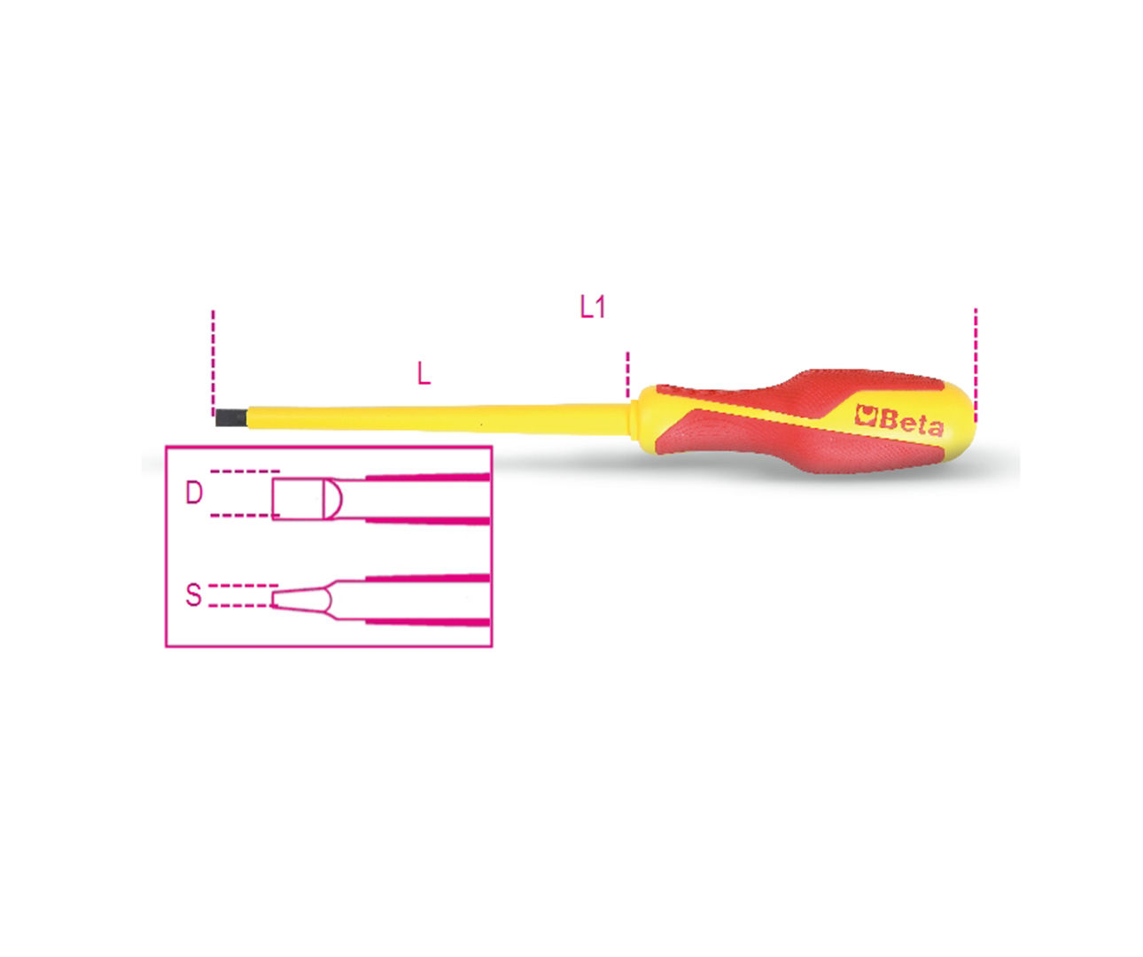 De schroevendraaier is geschikt om schroeven handmatig in- en uit te draaien. Deze rood/gele schroevendraaier voor verzonken sleufschroeven met ergonomische grip heeft een platte kop van 8 mm breed aan een geïsoleerde schacht van 175 mm lang.
