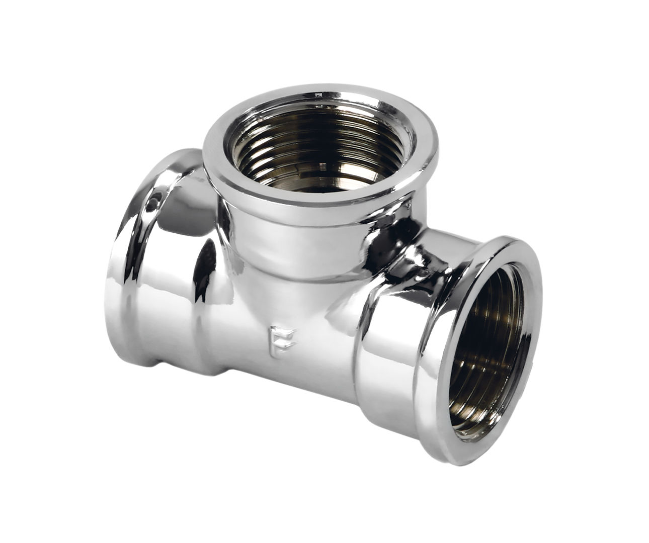 Messing T-stuk 3/4”F in chroom voor sanitaire toepassingen.