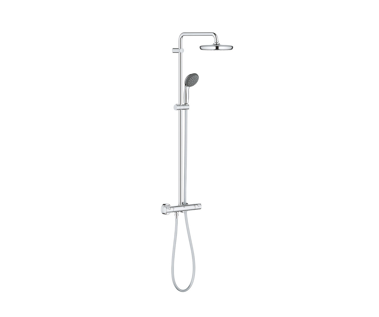 Het GROHE Vitalio Start 210 douchesysteem met thermostaat voegt instant designstijl en prestatie toe aan elke badkamer. GROHE DreamSpray zorgt ervoor dat de waterstroom uit elk sproeigaatje gelijk is - perfect voor de rustgevende Rain Spray van de Vitalio Start 210 mm hoofddouche. De 390 mm arm van de hoofddouche kan zelfs 180° worden gedraaid voor extra flexibiliteit. De nieuwe Vitalio Start handdouche van 100 mm heeft een TwistFree-slang van 1750 mm en twee stralen die bij je stemming passen: een kalmerende Rain Spray en de revitaliserende Jet Spray. De innovatieve GROHE EcoJoy-technologie beperkt de waterstroom in zowel de hoofd- als de handdouche – tot 9,5 l/m en 5,7 l/m – maar garandeert nog steeds volledig douchegenot.
