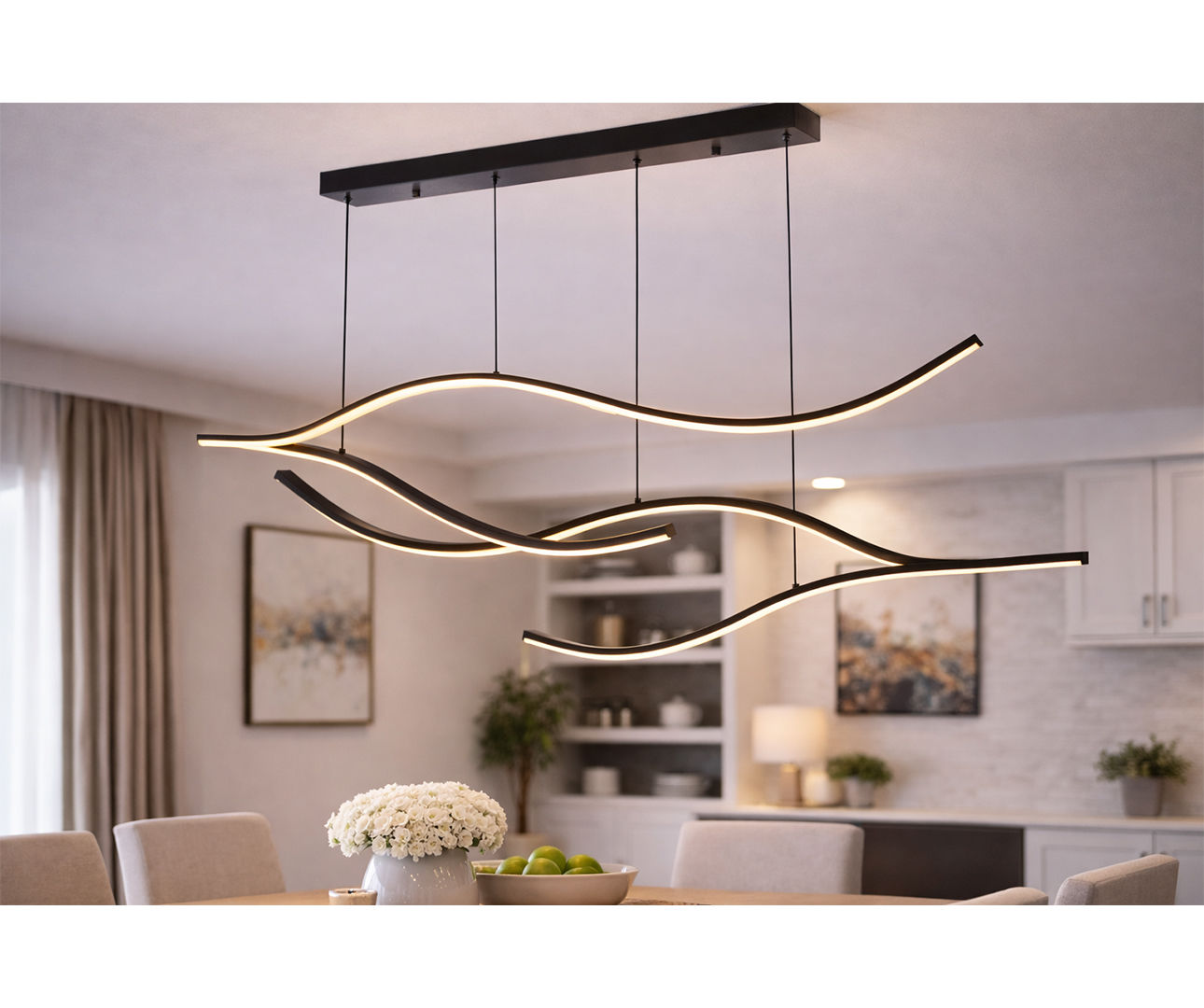 Technische specificatieType: decoratieve LED hanglamp, Vermogen: 55W, Lichtkleur: warm wit (3000K), Afwerking: zwart, Spanning: 100–240V, Frequentie: 50–60Hz, Toepassing: binnengebruik