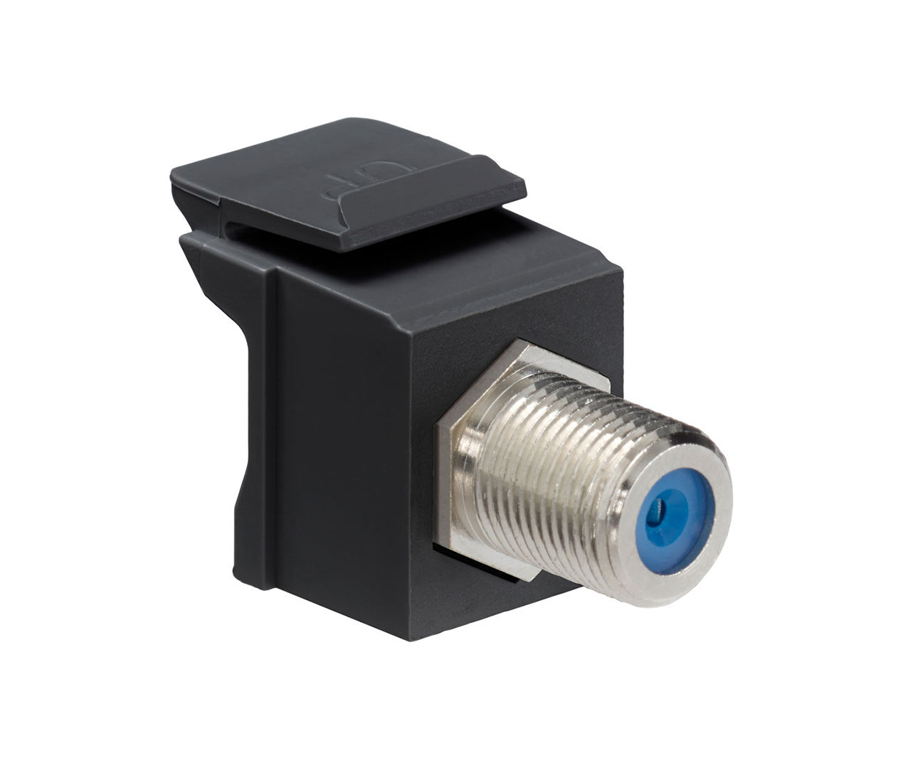 Vernikkelde of vergulde vrouw-naar-vrouw 75 ? connector met opschroefbare voor- en achteraansluitingen. Passeer ontwerptoepassingen: tv, videorecorder, dvd, satelliet en thuisbioscoop. Kabel: coaxiale kabel met "F"-stekkers. QuickPort F-type adapters klikken in elke QuickPort-behuizing, inclusief inbouw- en opbouwuitgangen, multimedia-uitgangssysteem (met adapter), Decora®-inzetstukken, patchpanelen en patchblokken.