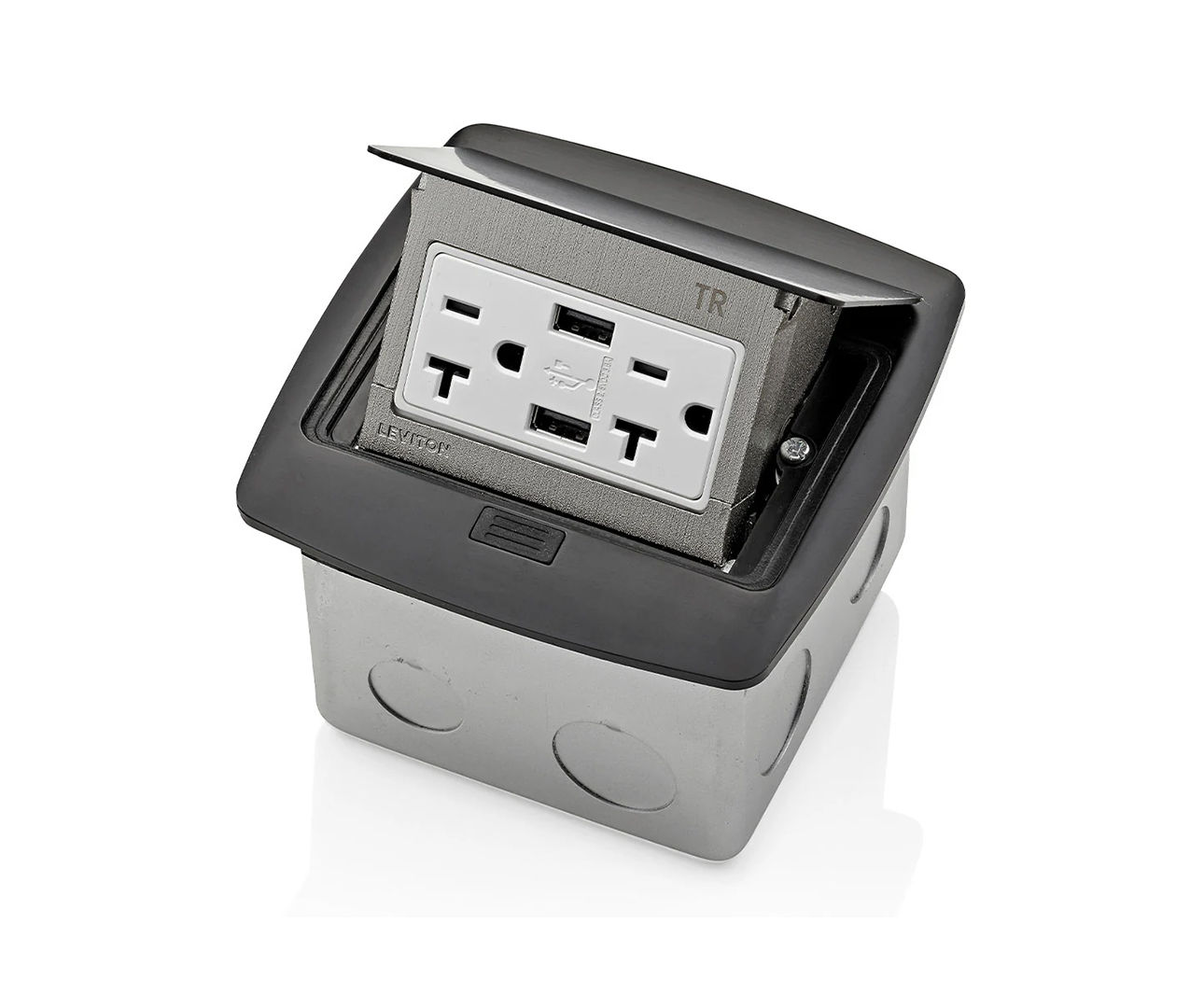 Pop-up vloerdoos met 20 ampère, 125 volt, NEMA: 5-20R, paal: 2, 3-draads, sabotagebestendig, decora, duplex contactdoos/stopcontact die voorbedraad is op het klemmenblok. Klemmenblok is voorbedraad voor gemakkelijke toegang, steek gewoon de draden in en draai de schroeven vast. Laag profiel, stijlvolle metalen afdekking die in de vloer uitsparingen wanneer deze niet in gebruik is, waardoor de hoogte boven de vloer wordt teruggebracht tot ¼ inch. Druk op de knop om toegang te krijgen. Voldoet aan of overtreft UL 514A inclusief schrobwatertest. IP 44-geclassificeerde bescherming tegen binnendringend water vanuit elke richting in gesloten toestand. Kan worden gebruikt met verschillende soorten vloeren: tegels, steen, hout, laminaat, tapijt, beton en vinyl.