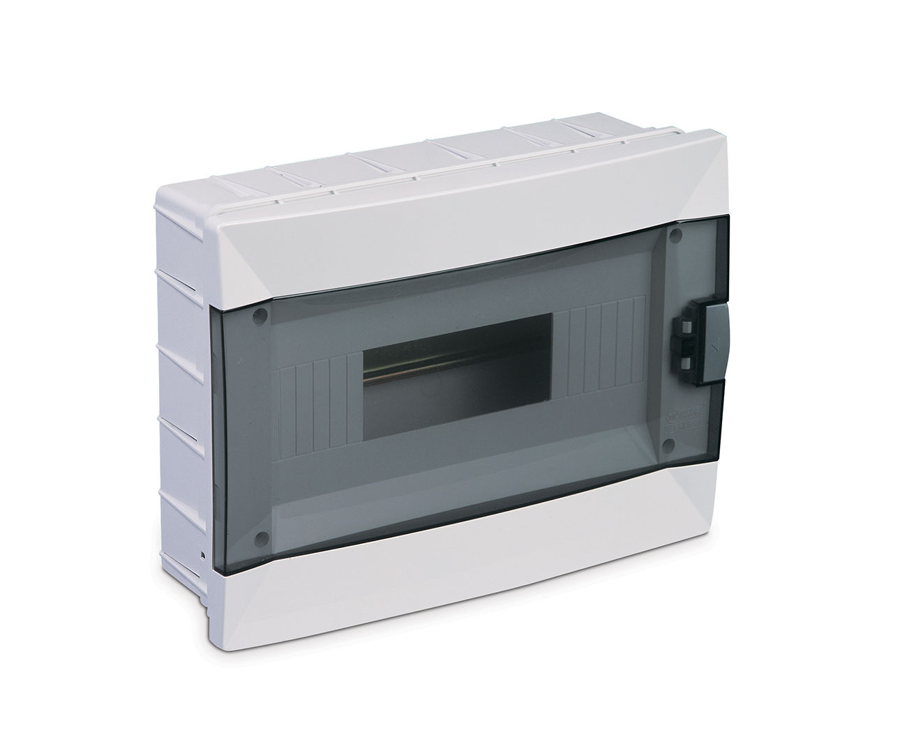 Deze MAKEL inbouw breakerkast met getinte deur biedt plaats aan 12 modules.