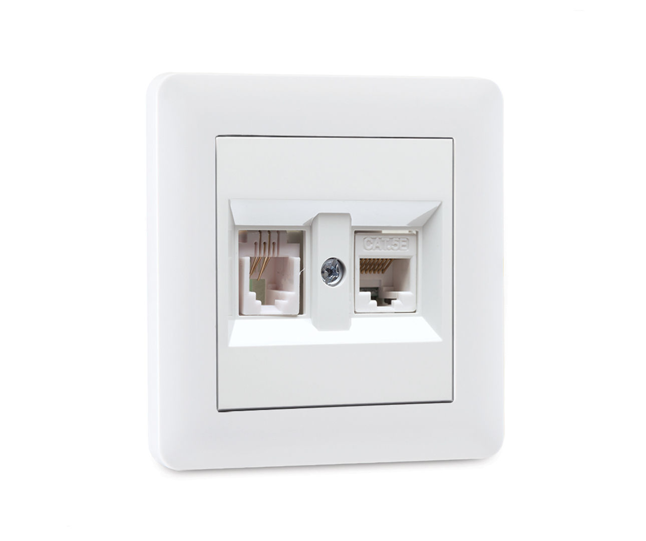Dit is een dubbele wandcontactdoos bestaande uit een CAT5-data-aansluiting (RJ45) en een telefoonaansluiting (RJ11). De socket is ontworpen voor vaste inbouwinstallaties en maakt het mogelijk om netwerk- en telefonieverbindingen te combineren op één aansluitpunt. Geschikt voor residentieel en commercieel gebruik, zoals woningen, kantoren en bedrijfsruimtes.