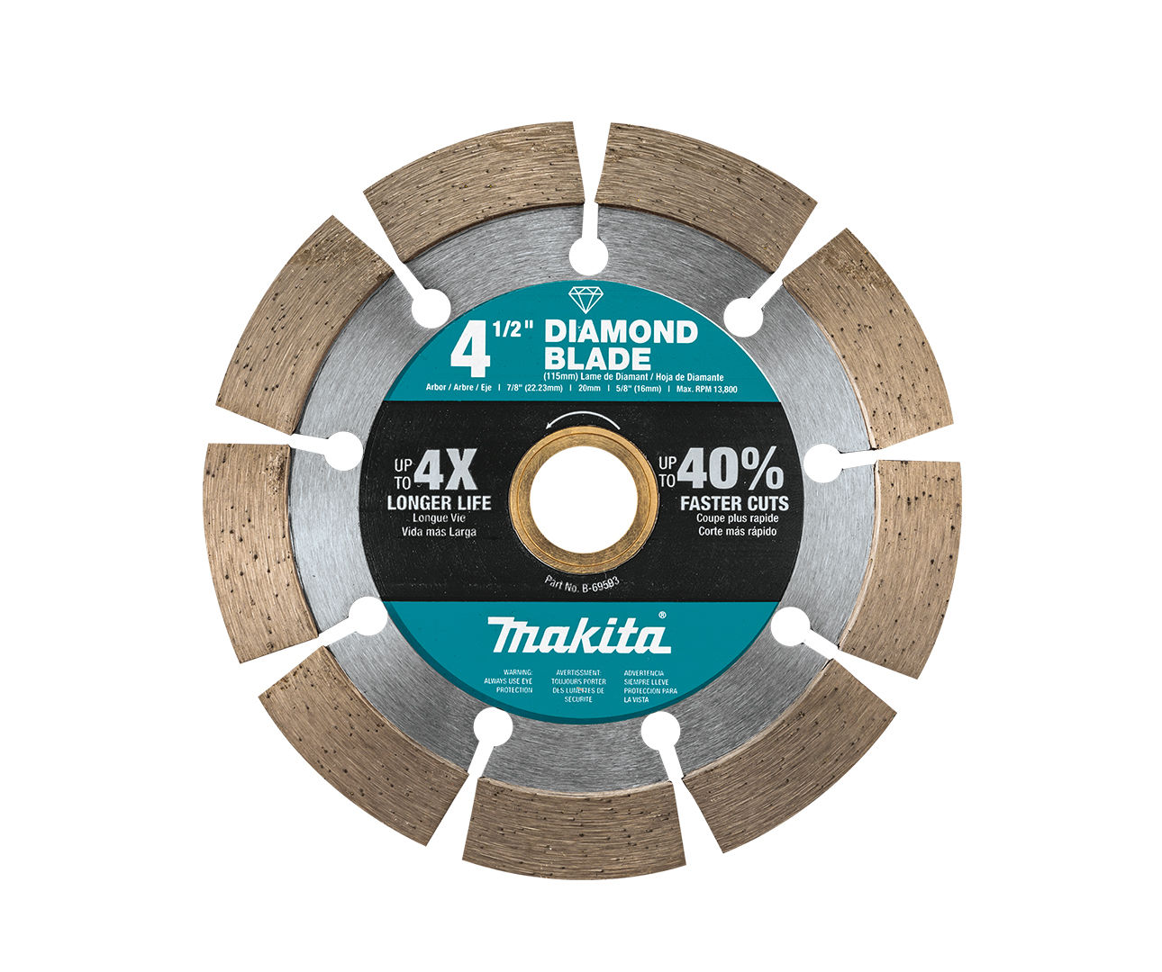 Het Makita 4-1/2" diamantzaagblad met gesegmenteerde rand is ideaal voor algemene zaagtoepassingen, waaronder blokken, baksteen en uitgehard beton. De gesegmenteerde sleuven zijn ontworpen om een snellere maar koelere snede te leveren. Diamantzaagbladen maken deel uit van Makita's groeiende assortiment oplossingen voor concrete toepassingen.