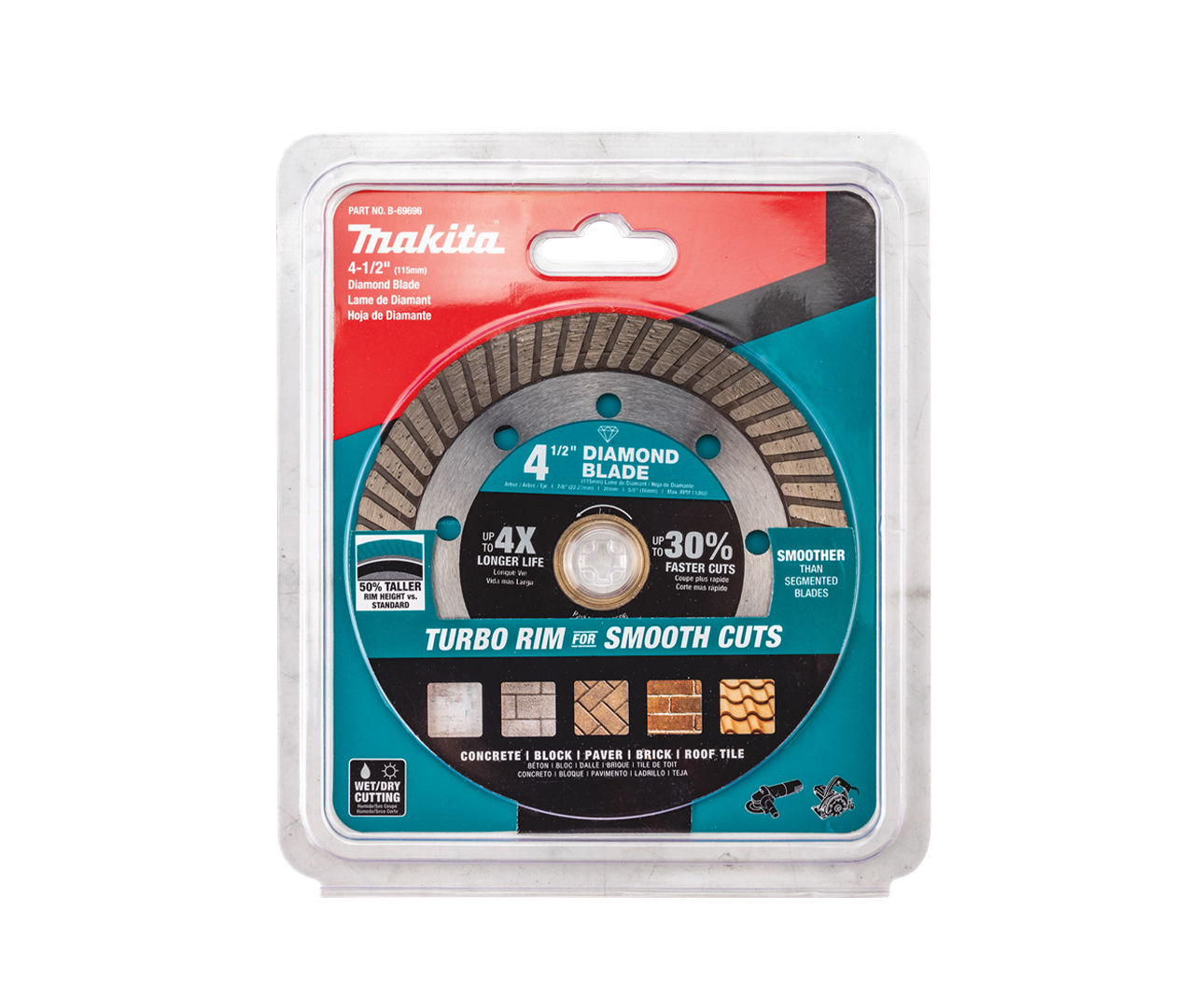 Het Makita 4-1/2" Turbo Rim diamantzaagblad is ideaal voor algemene zaagtoepassingen, waaronder blokken, baksteen en uitgehard beton. Het ontwerp van de turbovelg is ontworpen voor constant contact met het materiaal en zorgt voor een gladdere afwerking dan gesegmenteerde zaagbladen. maken deel uit van Makita's groeiende assortiment oplossingen voor betontoepassingen.