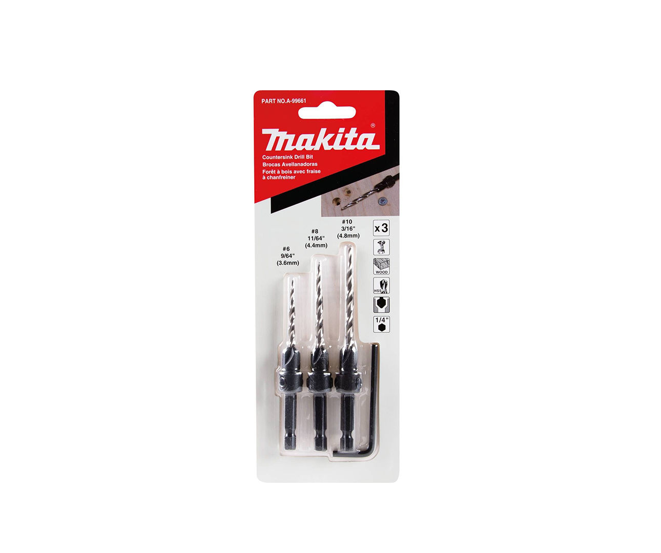 Makita heeft een uitgebreid assortiment boor-, aandrijf- en bevestigingsgereedschappen en accessoires. De Makita 3-delige verzinkboor met boorbitset met inbussleutel (A-99661) is ontworpen voor het boren van pilotgaten, verzinkboren en verzinkboringen in één eenvoudige handeling. De boor kan op de gewenste boordiepte worden ingesteld en de 1/4” zeskantschacht past in slagschroevendraaiers en boormachines. De 3-delige set bevat #6, #8 en #10 verzinkboren plus een inbussleutel.