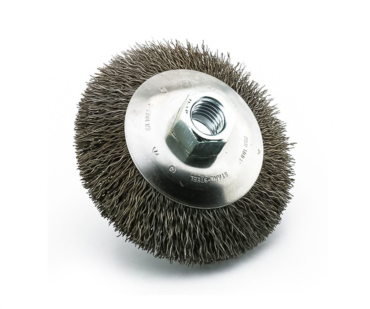Ronde staalborstel voor de haakse slijper. Hiermee zijn metalen oppervlakken snel van roest en slakken te ontdoen.
